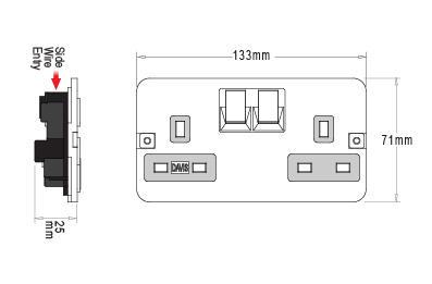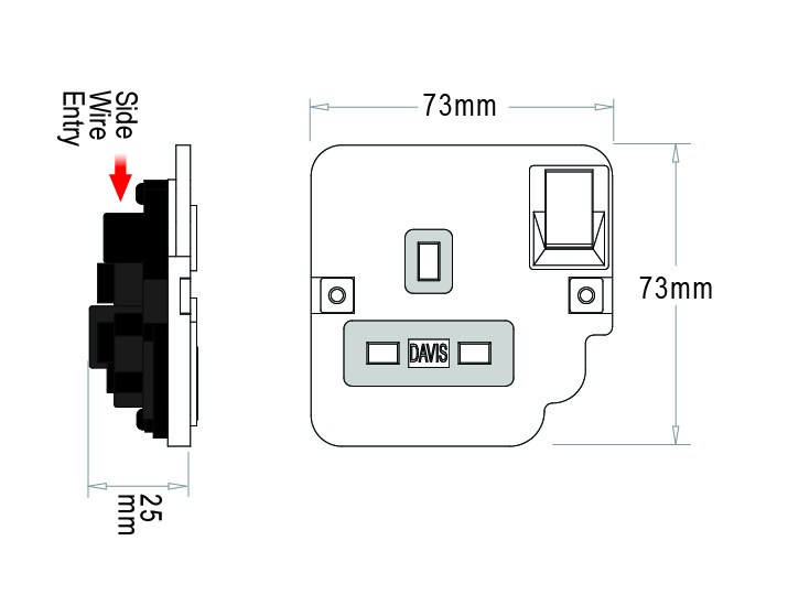 DAVIS one and two gang 13A Switched Socket Outlets are specially designed to be slim (25mm) with side wire entries to suit underfloor service boxes.